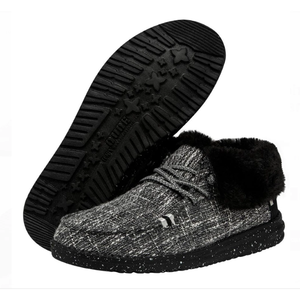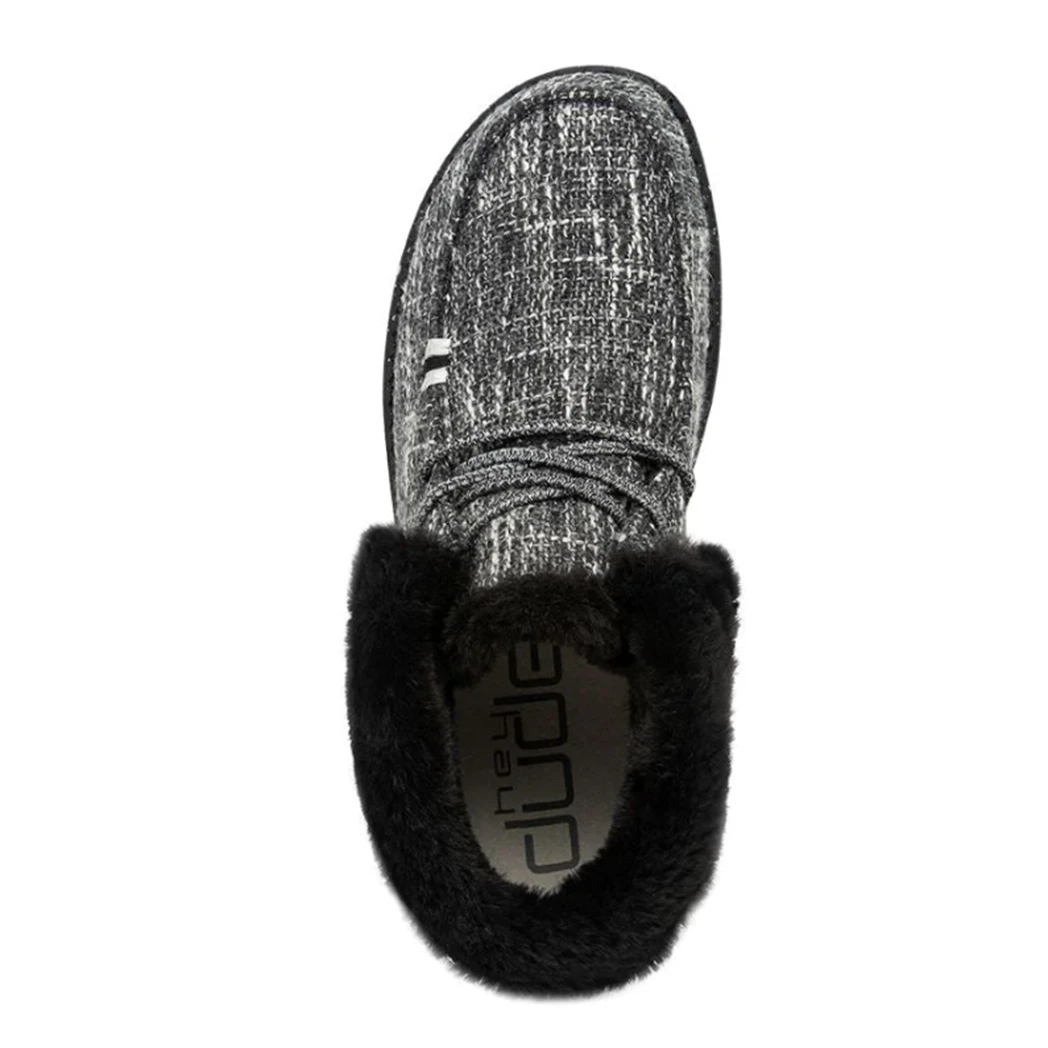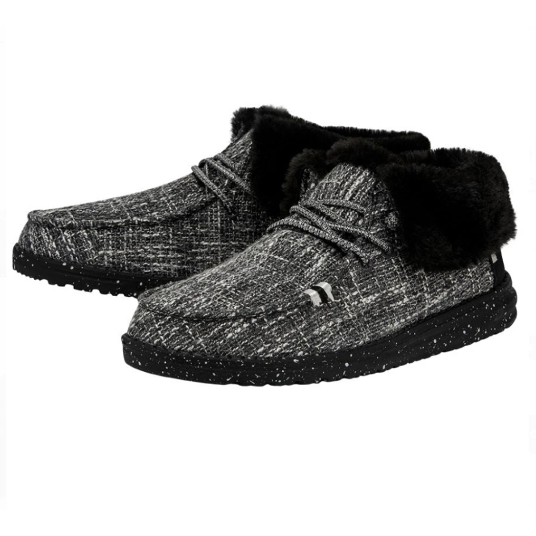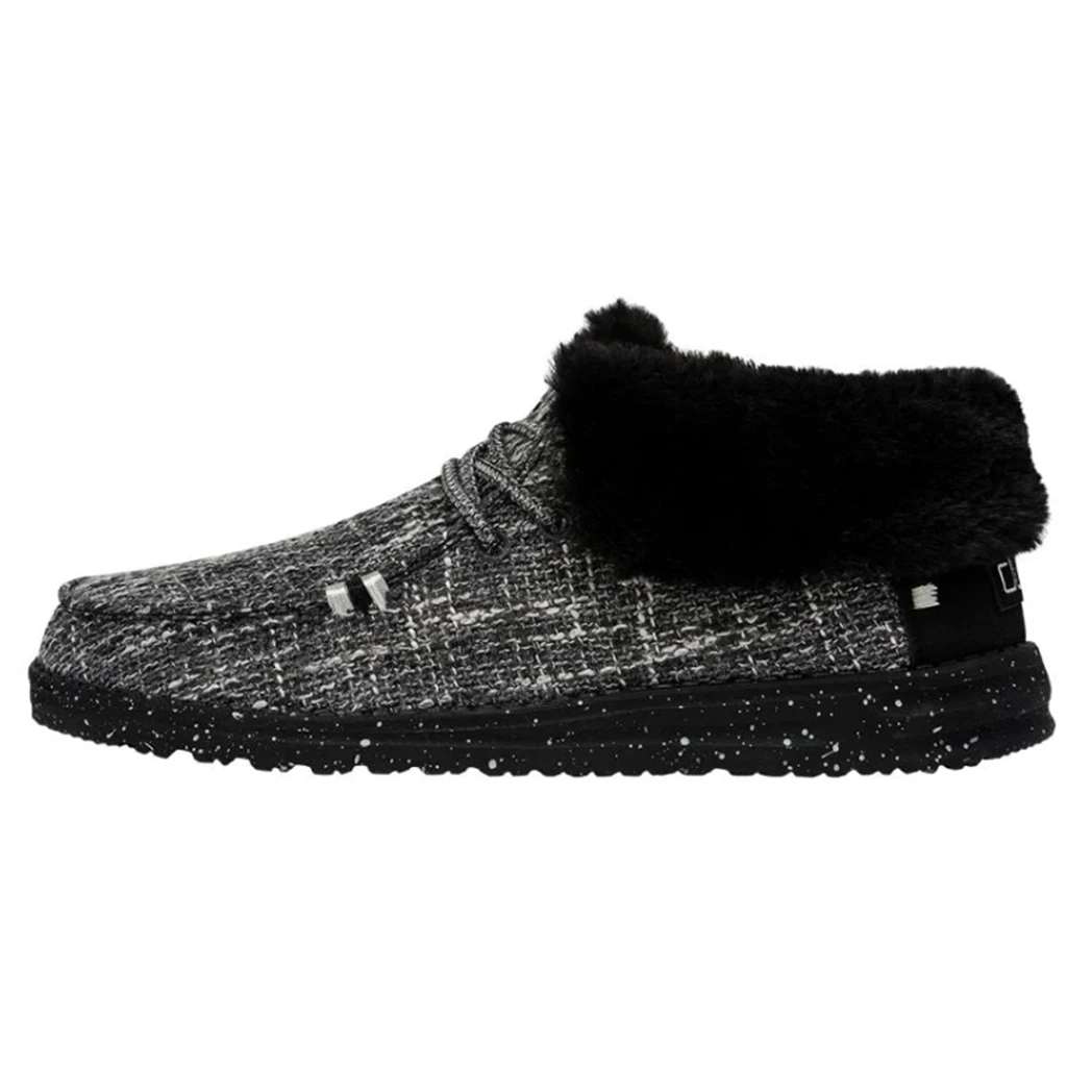 When the temps drop the Britt shoe from Hey Dude will be your go to! This fun and warm shoe features an ankle-high boot style, yet made with a soft, cotton- blend upper. This shoe features the Cookies & Cream design, a black and white canvas upper with contrasting heel detail and black faux fur lining and black ultra-light outsole.