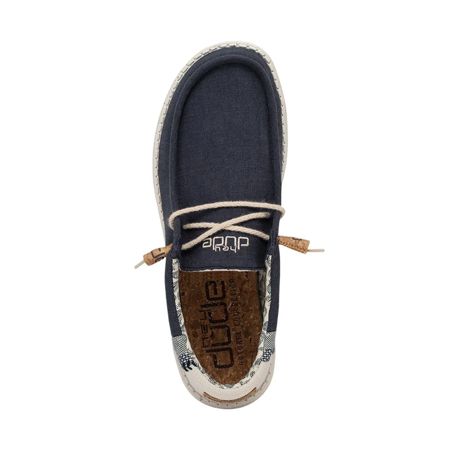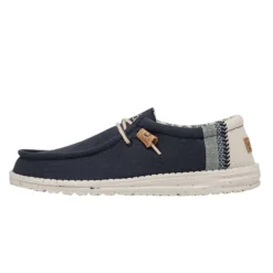 These Wally Linen Natural Navy Hey dudes have a classic moccasin construction in a breathable organic cotton canvas, with hemp reinforcement at the heel. Soft, cotton-fiber lining. Recycled cork, recycled rubber, and organic cotton details.